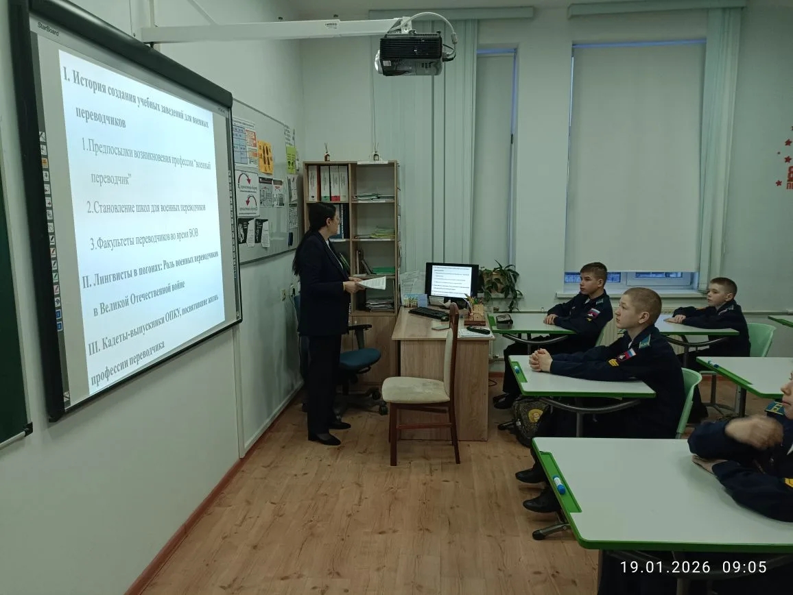 19 января кадеты 7 учебного курса в учебных классах главного учебного корпуса «Разговаривали о важном» с преподавателями кафедры иностранных языков на общую тему «Военные переводчики». Презентация, с которой выступили: Васина Л.М., Мерзлякова Т. Ю., Загидуллина О.М., Байшукурова Л.В., Лымарева Н.И. и Курманаева Т.А., подробно познакомила кадет с уникальной профессией, сочетающей лингвистические знания с военной подготовкой. Тема охватывала историю (включая работу в годы ВОВ), важность профессии в международных миссиях, переговорах и обороне, её особенностях и что это не только интересная, но и ещё опасная профессия.