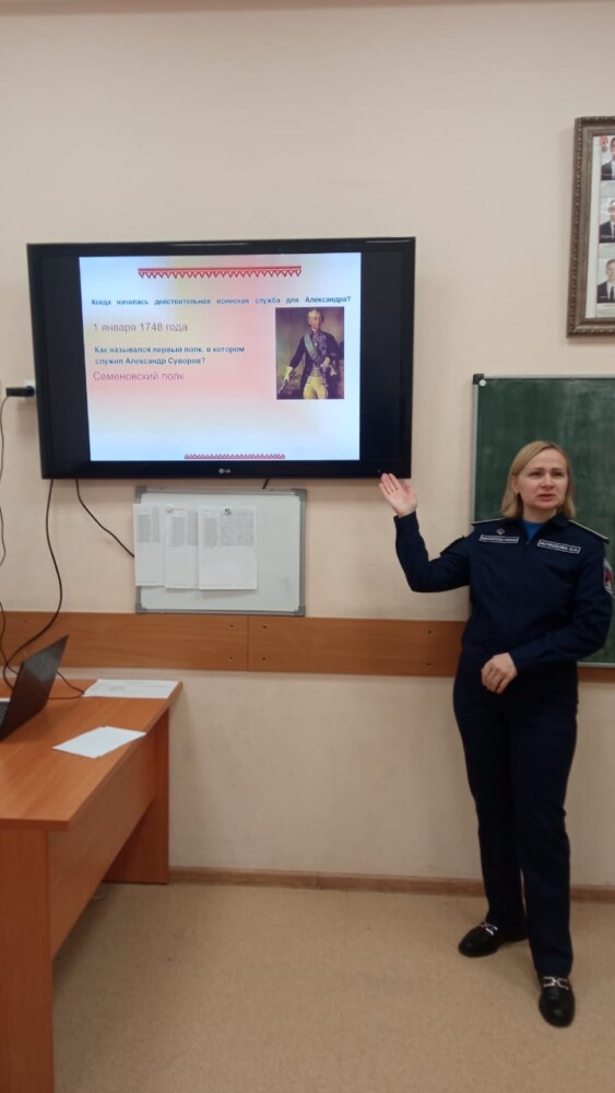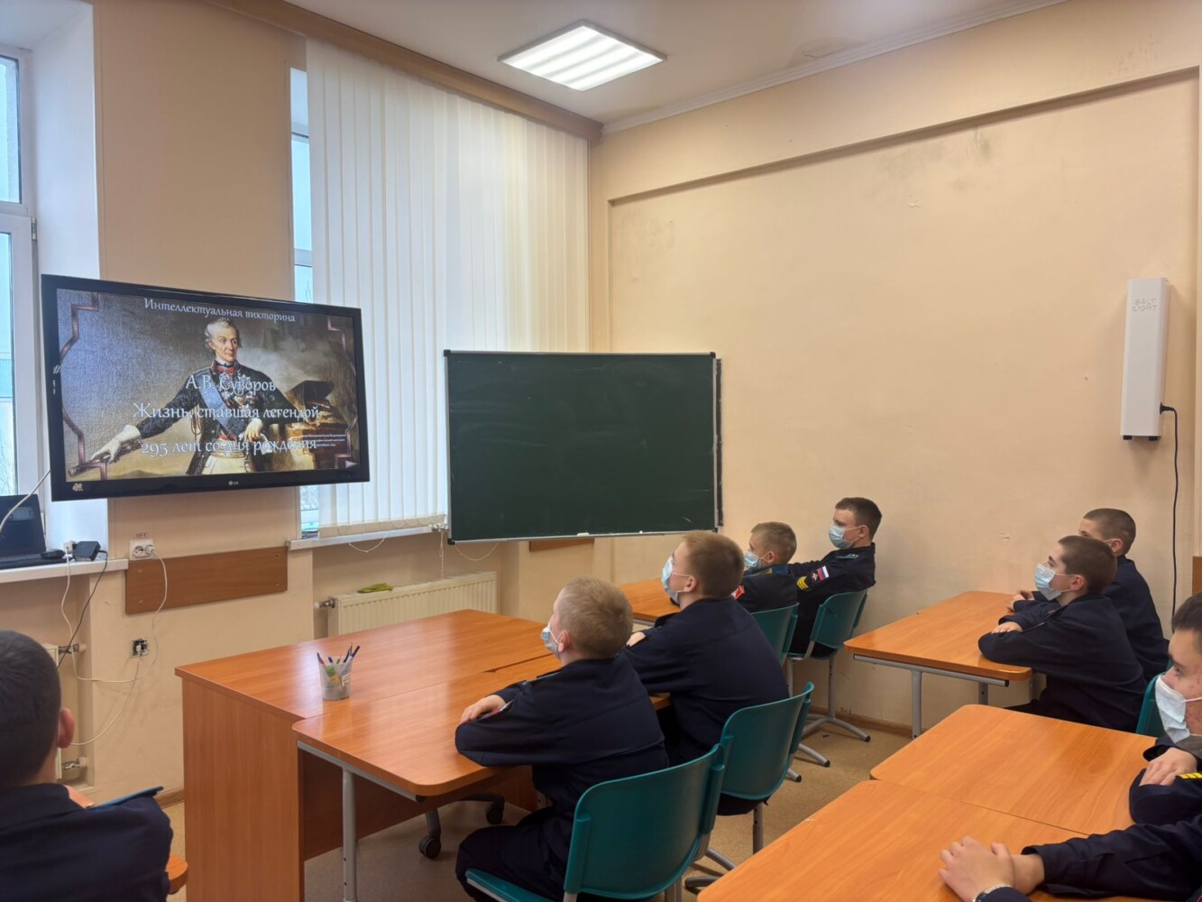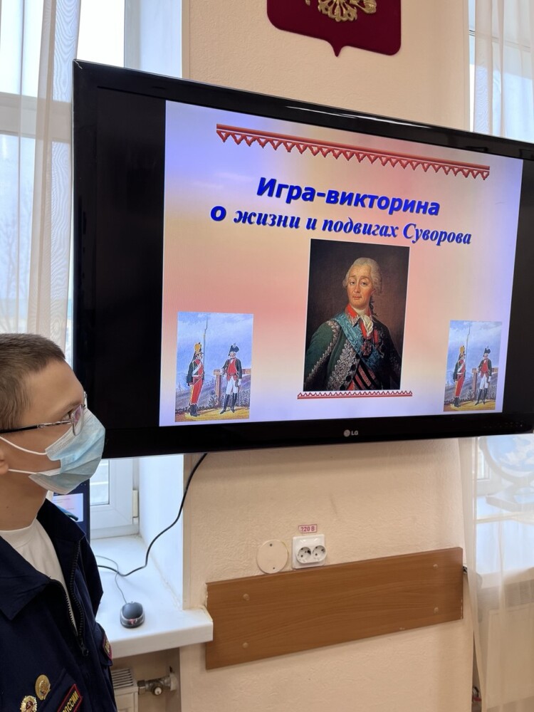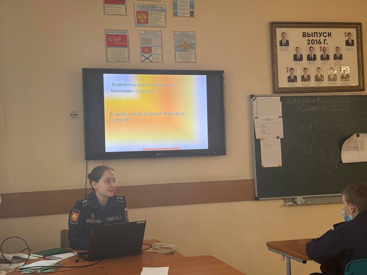 23 ноября накануне 295-летнего юбилея со дня рождения выдающегося русского полководца Александра Васильевича Суворова, в расположении 7 учебного курса прошла игра -викторина «О жизни и подвигах А.В. Суворова», которая состоит из четырёх тематических блоков, охватывающих ключевые аспекты жизни и деятельности полководца: факты его биографии, сражений, знаменитые высказывания и память о нем. Его имя неразрывно связано с эпохой триумфов русской армии XVIII века. Не потерпев ни единого поражения в более чем шестидесяти сражениях, Суворов справедливо считается олицетворением военной доблести и гениального стратега.